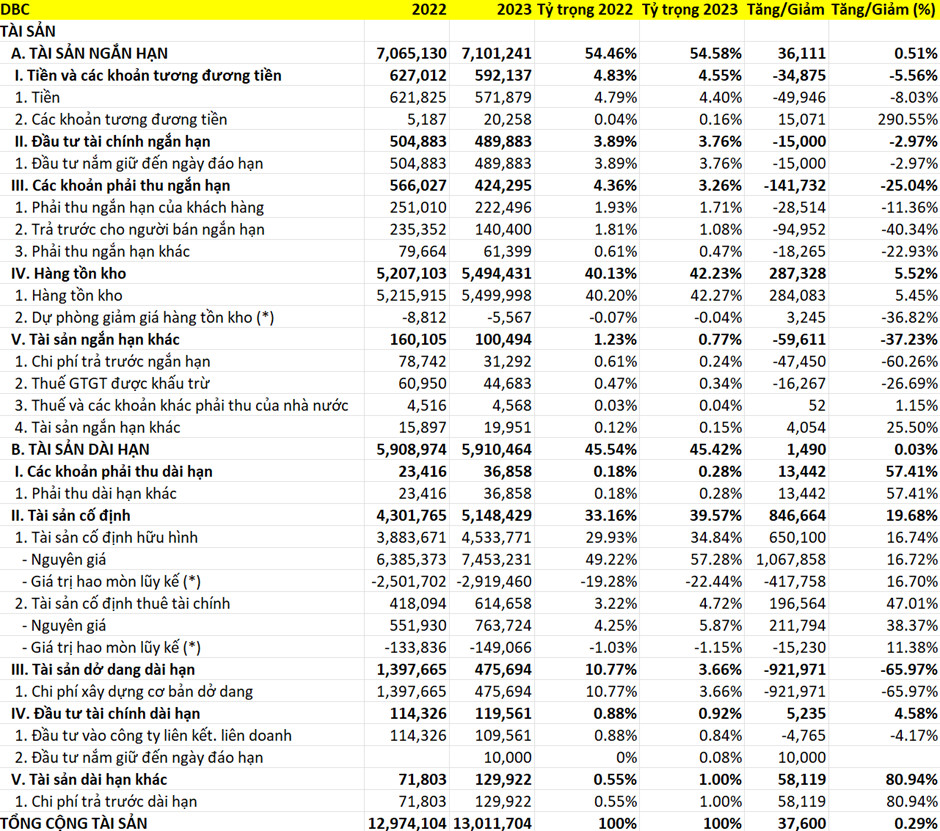 Có thể thấy, tổng tài sản của DBC tăng nhẹ so với năm 2022 chủ yếu do hàng tồn kho tăng do chi phí sản xuất kinh doanh dở dang.