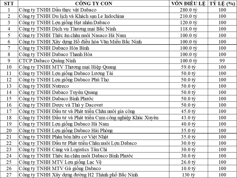 Tính đến cuối 2023, Dabaco có tổng cộng 27 công ty con thuộc các lĩnh vực nông nghiệp, dịch vụ thương mại và đầu tư xây dựng, hầu hết đều là Dabaco nắm 100% vốn điều lệ và có 2 công ty liên kết.