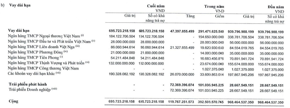Khoản vay dài hạn đến hạn trả chủ yếu đến từ vay Ngân hàng TMCP Ngoại thương Việt Nam (154 tỷ).