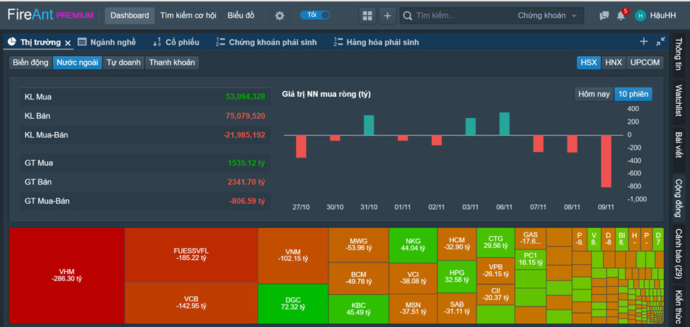 – Phiên giao dịch ngày 09.11 thị trường giằng co với dòng tiền phân hóa, vẫn rất nhiều cổ phiếu duy trì được đà tăng tốt từ phiên trước, tuy nhiên áp lực từ nhóm cổ phiếu ngân hàng đã làm thu hẹp đà tăng của thị trường. Bên cạnh đó áp lực bán từ nhà đầu tư nước ngoài làm cản đà tăng của thị trường.