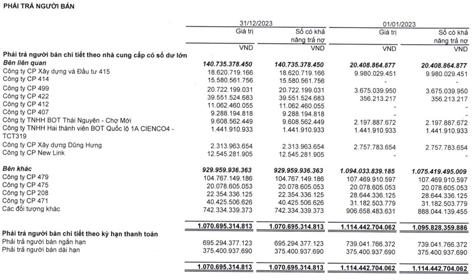 + Trả trước cho người bán ngắn hạn: tại thời điểm 31/12/2023 của Công ty là 729 tỷ đồng, tăng 337 tỷ so với năm 2022 (tương ứng 85.99%). Trong đó, khoản trả trước cho bên liên quan là 373 tỷ đồng và khoản trả trước cho bên khác là 346 tỷ đồng, gồm 6 tỷ đồng khoản trả trước cho CTCP An Đạt Phú, 38 tỷ đồng cho Công ty TNHH Xây dựng Công trình và Thương mại Hoàng Anh, 19 tỷ đồng cho CTCP tư vấn và Xây dựng Biển Đông, 18 tỷ đồng cho CTCP Xây dựng Công trình Giao thông Thái Sơn và 264 tỷ đồng trả trước cho các khách hàng khác.
