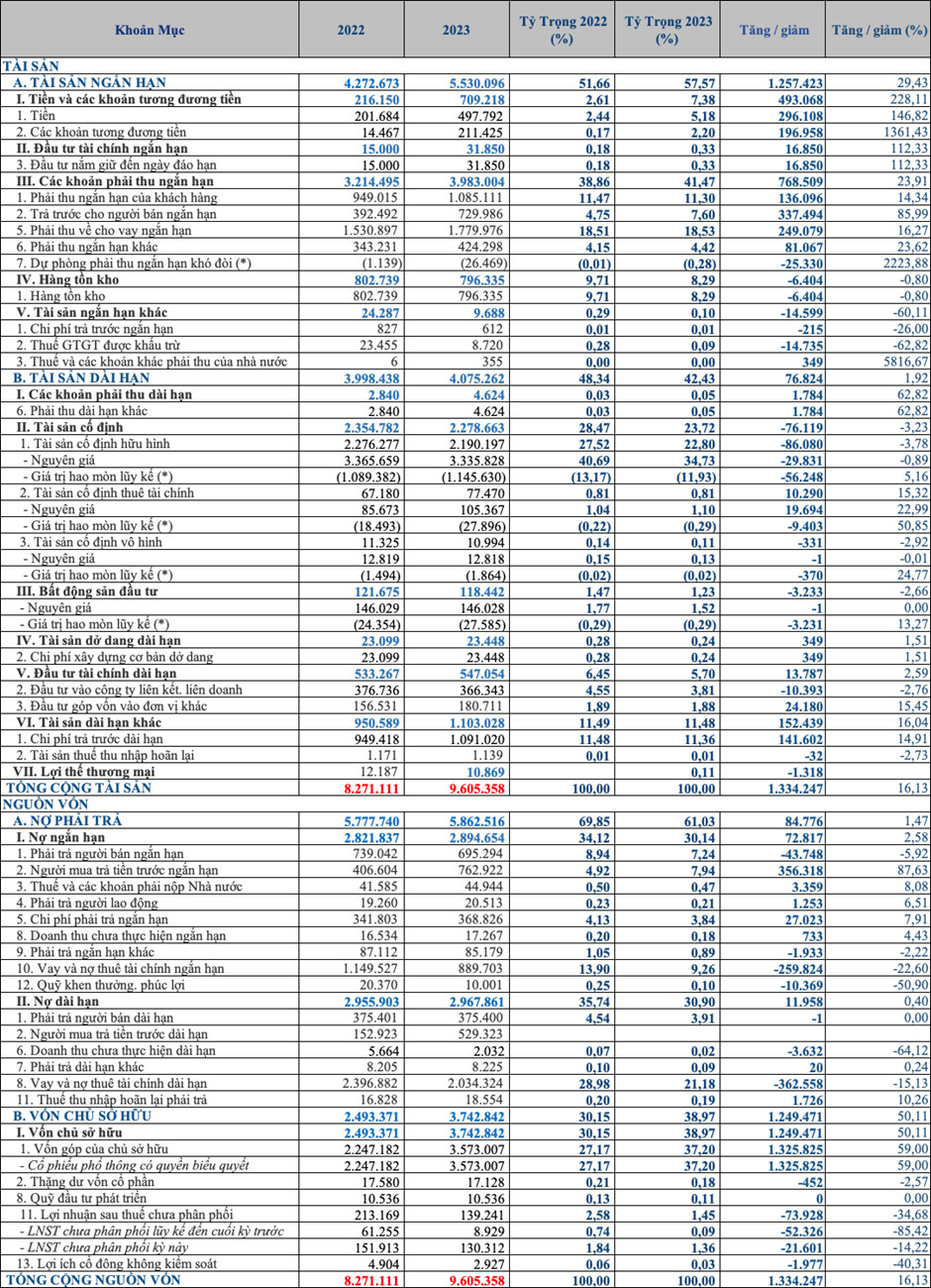 Tổng tài sản của công ty thời điểm 31/12/2023 là 9,605 tỷ đồng, tăng 1,334 tỷ đồng so với năm 2022 (tương ứng 16.13%). Trong đó Tài sản ngắn hạn là 5,530 tỷ đồng, chiếm 57.57% và tài sản dài hạn 4,075 tỷ đồng chiếm 42.43% tổng tài sản.