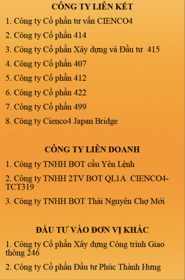 Tính đến 31/12/2023, CTCP CIENCO4 có 4 công ty con, 12 công ty liên doanh, liên kết và đầu tư vào hai đơn vị khác.