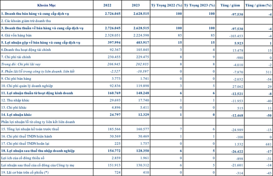 – Giá vốn hàng bán là 2,224 tỷ đồng, giảm 103 tỷ đồng (tương đương 4%) so với năm 2022.