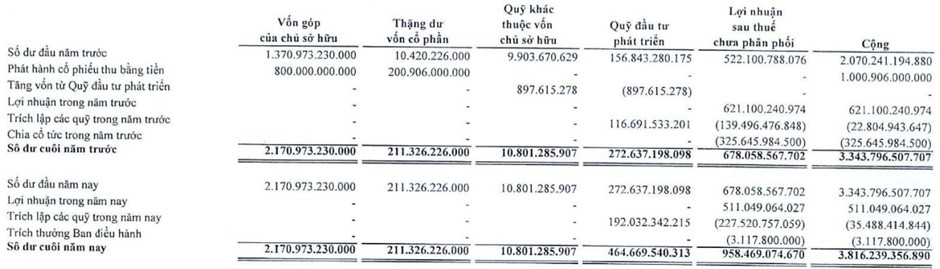 Công ty trích lập quỹ khen thưởng, phúc lợi với số dư tại 31/12/2022 là 44 tỷ, tăng 11 tỷ so với năm trước.