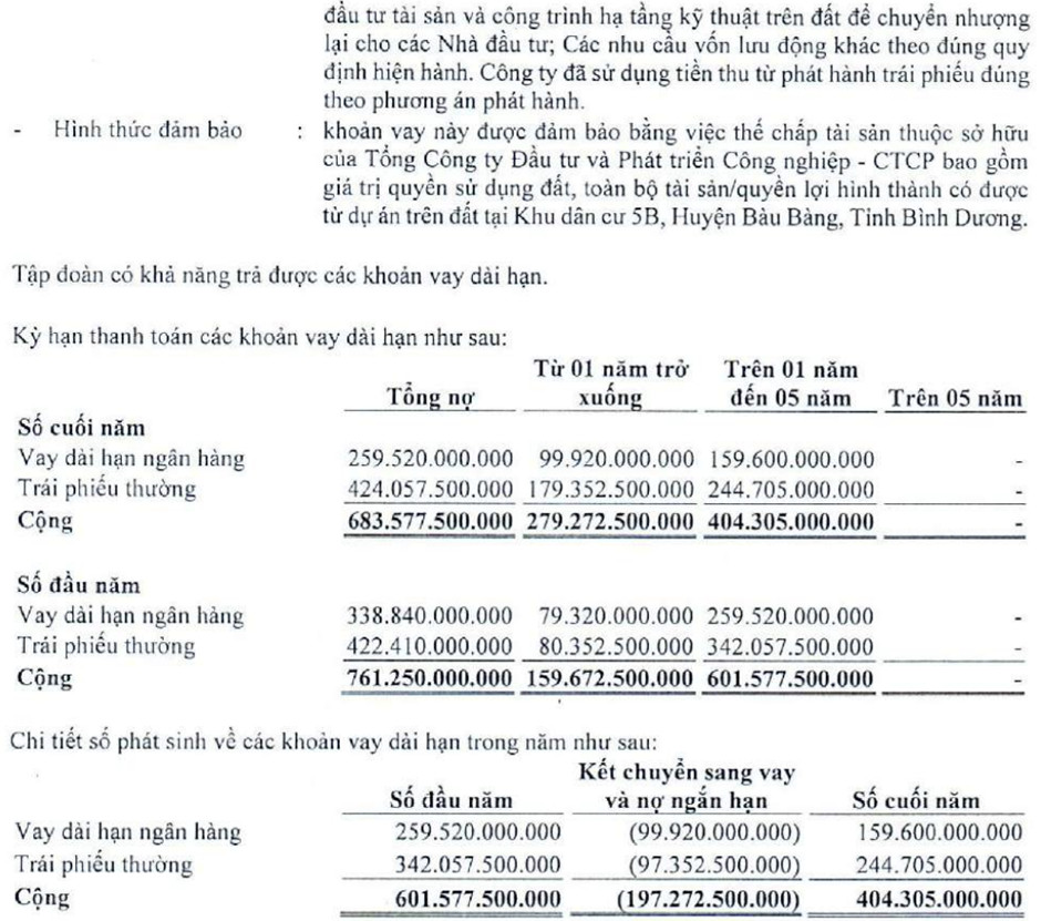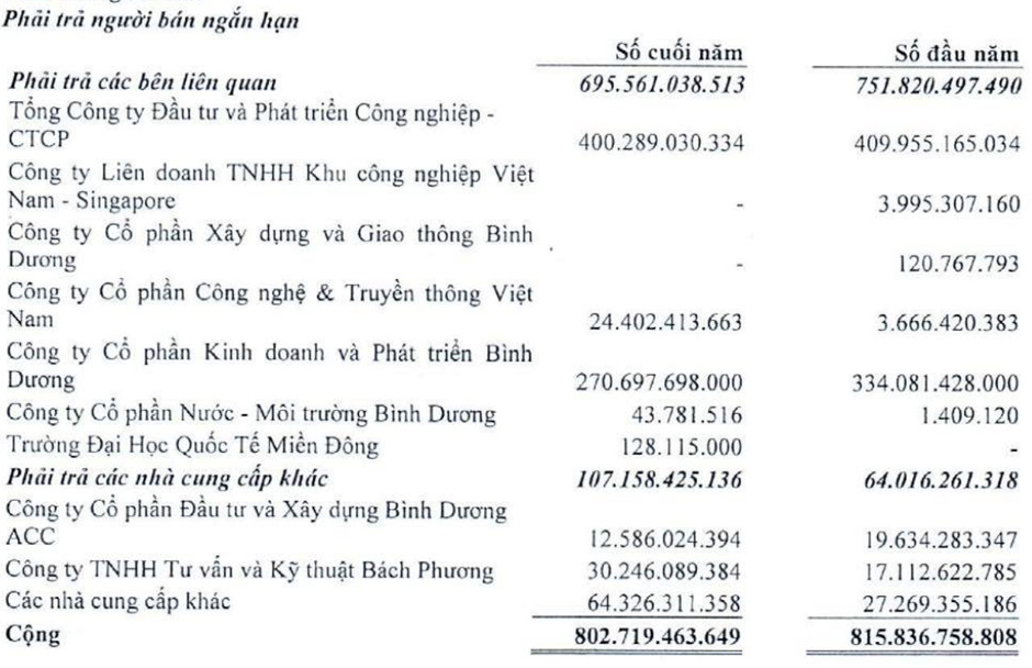 – Phải trả người bán ngắn hạn tại thời điểm 31/12/2022 là 803 tỷ, giảm 13 tỷ so với năm 2021 (tương ứng 1,61%), khoản lớn nhất (400 tỷ) đến từ đối tác kinh doanh là Tổng Công ty Đầu tư và Phát triển Công nghiệp – Công ty Cổ phần, Công ty Liên doanh Trách nhiệm hữu hạn Khu Công nghiệp Việt Nam – Singapore.
