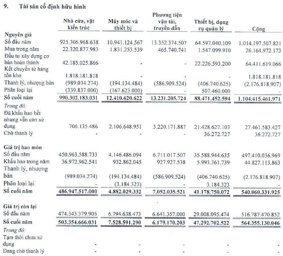 – Tài sản cố định hữu hình của Công ty tại thời điểm 31/12/2022 là 564 tỷ, tăng 48 tỷ so với năm 2021 (tương ứng 9,2%), chủ yếu là nhà cửa, vật kiến trúc (990 tỷ) và thiết bị, dụng cụ quản lý (88 tỷ).