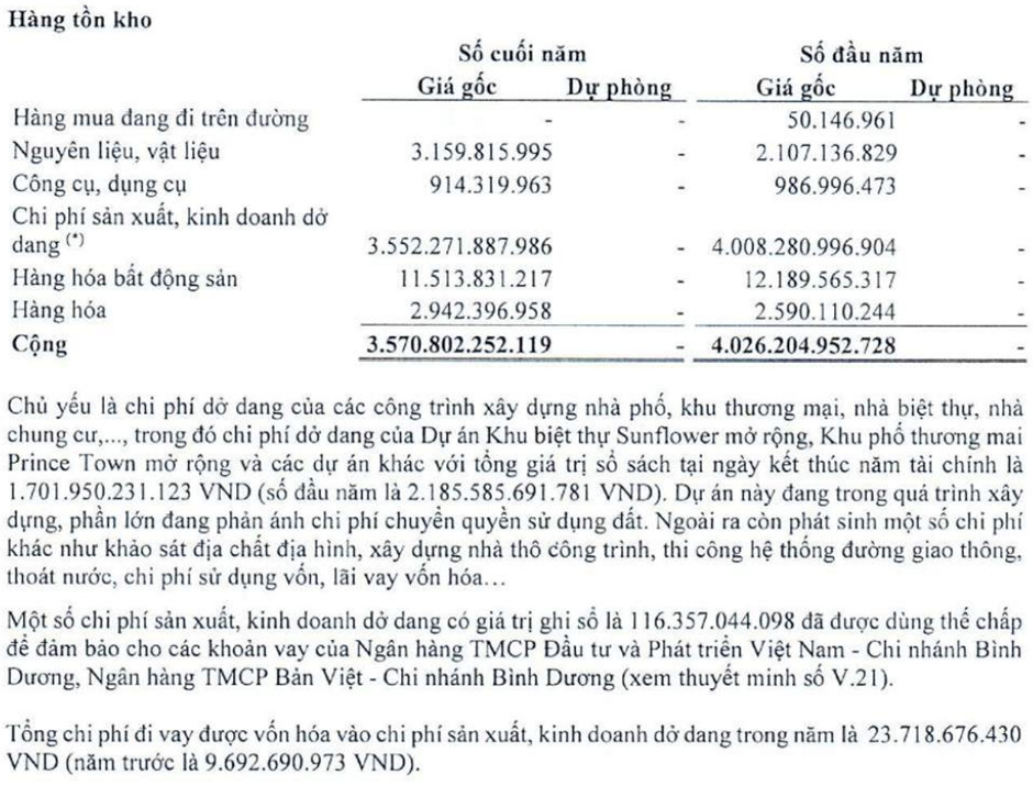 Chi phí sản xuất, kinh doanh dở dang chiếm gần 99% hàng tồn kho, là chi phí của các dự án công trình xây dựng mà Becamex đầu tư, chủ yếu giảm ở Dự án Khu biệt thự Sunflower mở rộng, Khu phố thương mại Prince Town và các dự án khác. Chi phí được phản ánh phần lớn là chi phí quyền sử dụng đất.