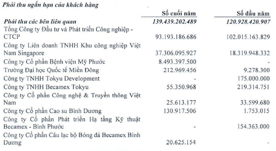 + Phải thu ngắn hạn của khách hàng tại thời điểm 31/12/2022 là 553 tỷ, Chiếm 8,48% tổng tài sản, tăng 88 tỷ so với năm 2021 (tương ứng 19,05%). Khoản phải thu lớn nhất (413 tỷ) đến từ các khách hàng khác. Ngoài ra, khách hàng lớn nhất đến từ bên liên quan (93 tỷ) là Tổng công ty Đầu tư và Phát triển Công nghiệp – Công ty cổ phần Công ty Liên doanh Trách nhiệm hữu hạn Khu công nghiệp Việt Nam Singapore.