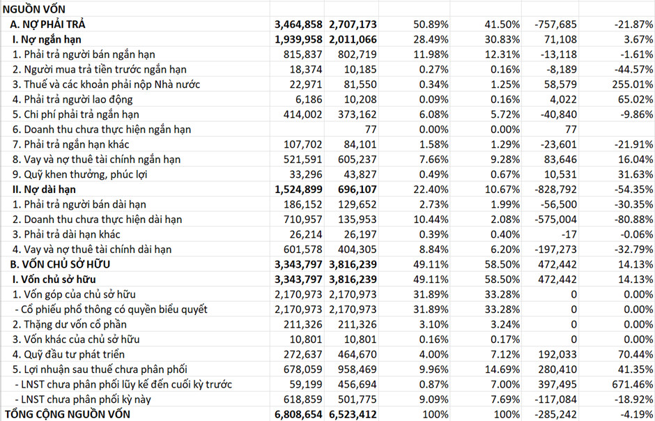 b/ Nợ dài hạn của Công ty tại thời điểm 31/12/2022 là 696 tỷ, chiếm 10,67% tổng nguồn vốn. Giảm 829 tỷ so với năm 2021 (tương ứng 54,35%). Bao gồm các khoản: Phải trả người bán dài hạn 130 tỷ, Doanh thu chưa thực hiện dài hạn 136 tỷ, Vay và nợ thuê tài chính dài hạn 404 tỷ, Phải trả dài hạn khác 26 tỷ.