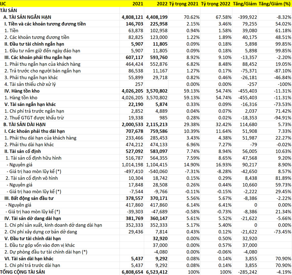 Qua bảng cân đối kế toán của IJC ta thấy, tài sản của IJC chủ yếu là tài sản ngắn hạn, hàng tồn kho chiếm tỷ trọng rất lớn. Công ty giảm và duy trì mức hàng tồn kho phù hợp với ngành và có lượng tiền mặt khá lớn.