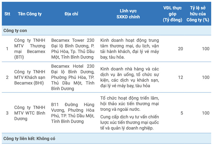 Tính đến ngày 31/12/2022, Becamex IJC có tổng cộng 3 công ty con, đều kinh doanh hoạt động dịch vụ và cung cấp cho thuê bất động sản.