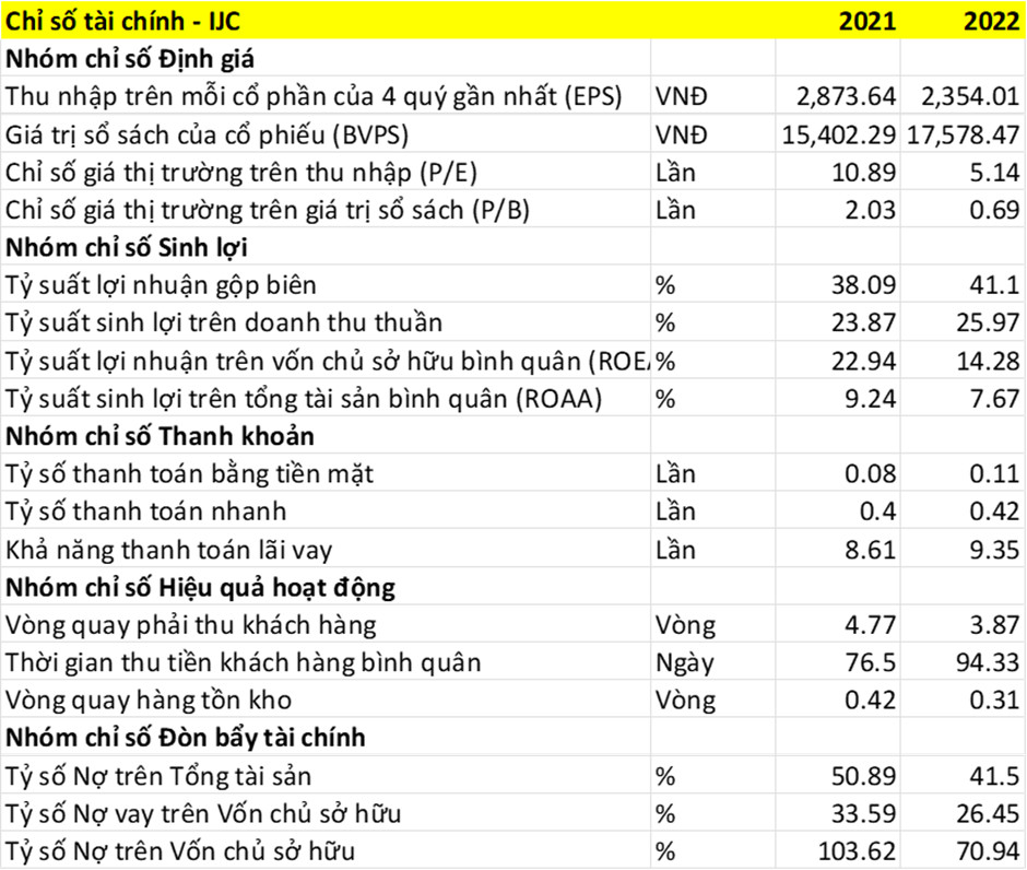 a) Nợ ngắn hạn: Tại thời điểm 31/12/2022 Nợ ngắn hạn của IJC là 2011 tỷ, tăng 71 tỷ so với năm 2021 (tương ứng 3,67%) . Bao gồm các khoản: Phải trả người bán ngắn hạn 803 tỷ, Người mua trả tiền trước ngắn hạn 10 tỷ, Thuế và các khoản phải nộp Nhà nước 82 tỷ, Phải trả người lao động 10 tỷ, Chi phí phải trả ngắn hạn 373 tỷ, Doanh thu chưa thực hiện ngắn hạn 77 tỷ, Phải trả ngắn hạn khác 84 tỷ, Vay và nợ thuê tài chính ngắn hạn 605 tỷ, Quỹ khen thưởng, phúc lợi 43 tỷ.