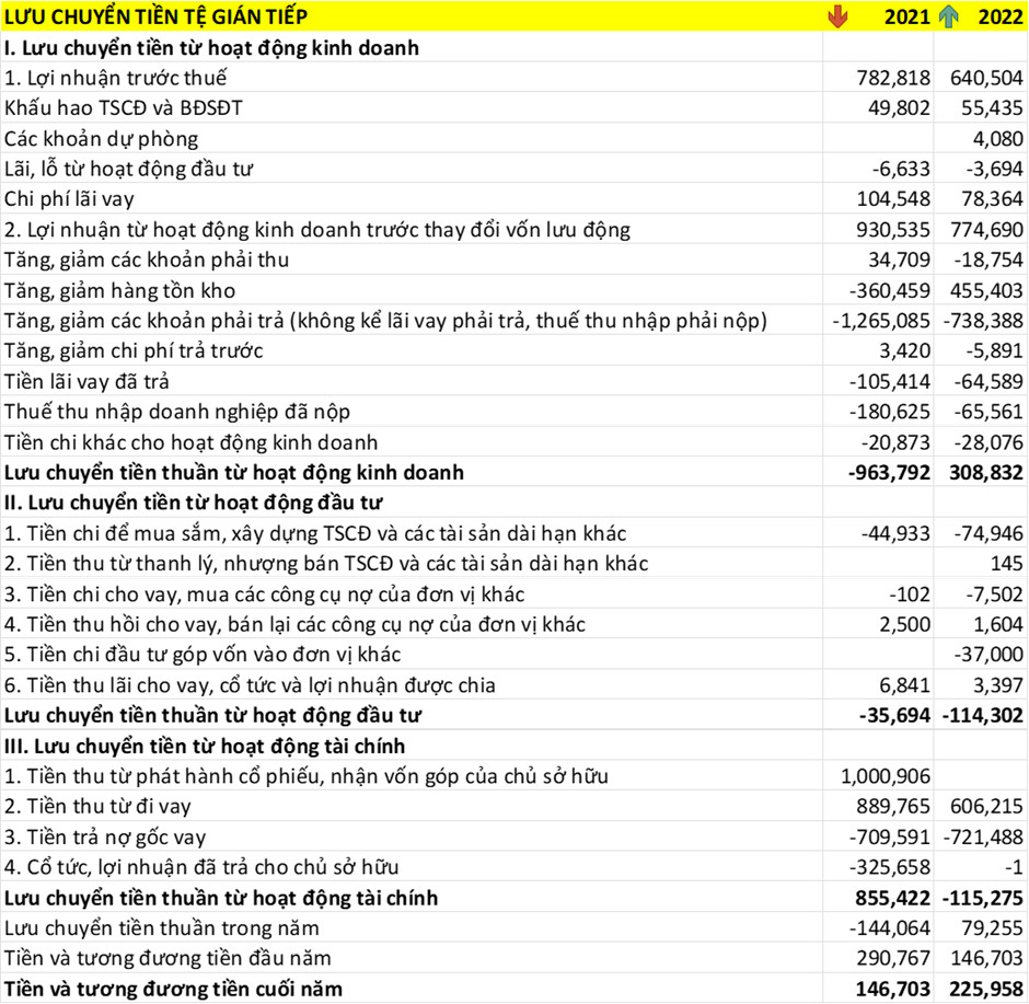Lưu chuyển tiền thuần từ hoạt động kinh doanh đạt 309 tỷ và tăng 132% so với năm 2021. Lưu chuyển tiền thuần từ hoạt động đầu tư đạt -114 tỷ đồng và tăng hơn 3 lần so với năm 2021. Trong khi đó, lưu chuyển tiền tệ từ hoạt động tài chính đạt -115 tỷ và giảm 970 tỷ so với năm 2021.