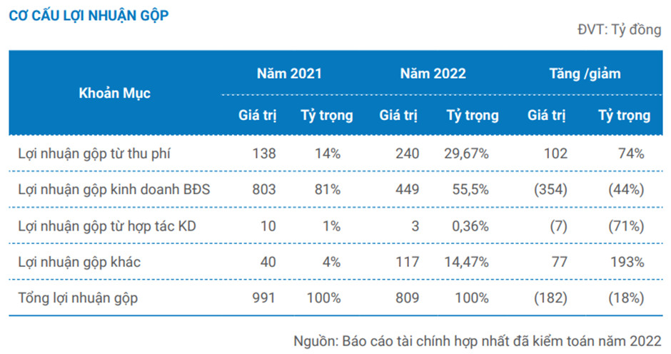 Nhìn chung, trong năm 2022, do bị ảnh hưởng giảm doanh thu từ hoạt động kinh doanh bất động sản, tổng lợi nhuận gộp của công ty đạt 809 tỷ, giảm 182 tỷ, tương ứng giảm 18% so với năm 2021.