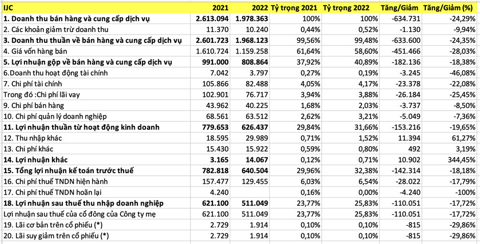 Lũy kế cả năm, doanh thu của IJC đạt 1.515 tỷ, giảm 23,4% so với cùng kỳ năm trước và đạt 92,71% kế hoạch. Lợi nhuận sau thuế đạt 395 tỷ, giảm 23% so với cùng kỳ và đạt 79% kế hoạch.
