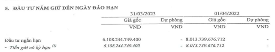 – Các khoản đầu tư tài chính ngắn hạn: tại thời điểm 31/03/2023 là 6.108 tỷ đồng, chiếm 43,09% tổng tài sản, giảm 1.905 tỷ so với năm 2021 ( tương ứng mức giảm 23,78%), đây là các khoản tiền gửi có kỳ hạn từ 03 tháng đến 12 tháng tại các ngân hàng thương mại với lãi suất từ 3,3% đến 11,0%.