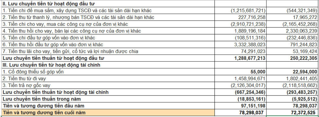 Lưu chuyển tiền thuần từ hoạt động đầu tư là 250 tỷ đồng giảm 1.039 tỷ so với năm 2021.