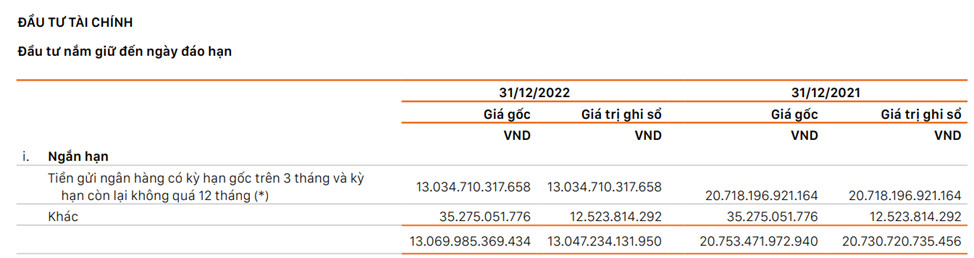 Ngoài ra, đầu tư nắm giữ đến ngày đáo hạn là 10.2 tỷ đồng, chiếm 0.02% tổng tài sản công ty. Khoản đầu tư nắm giữ đến ngày đáo hạn này là tiền gửi ngân hàng có kỳ hạn còn lại trên 12 tháng.