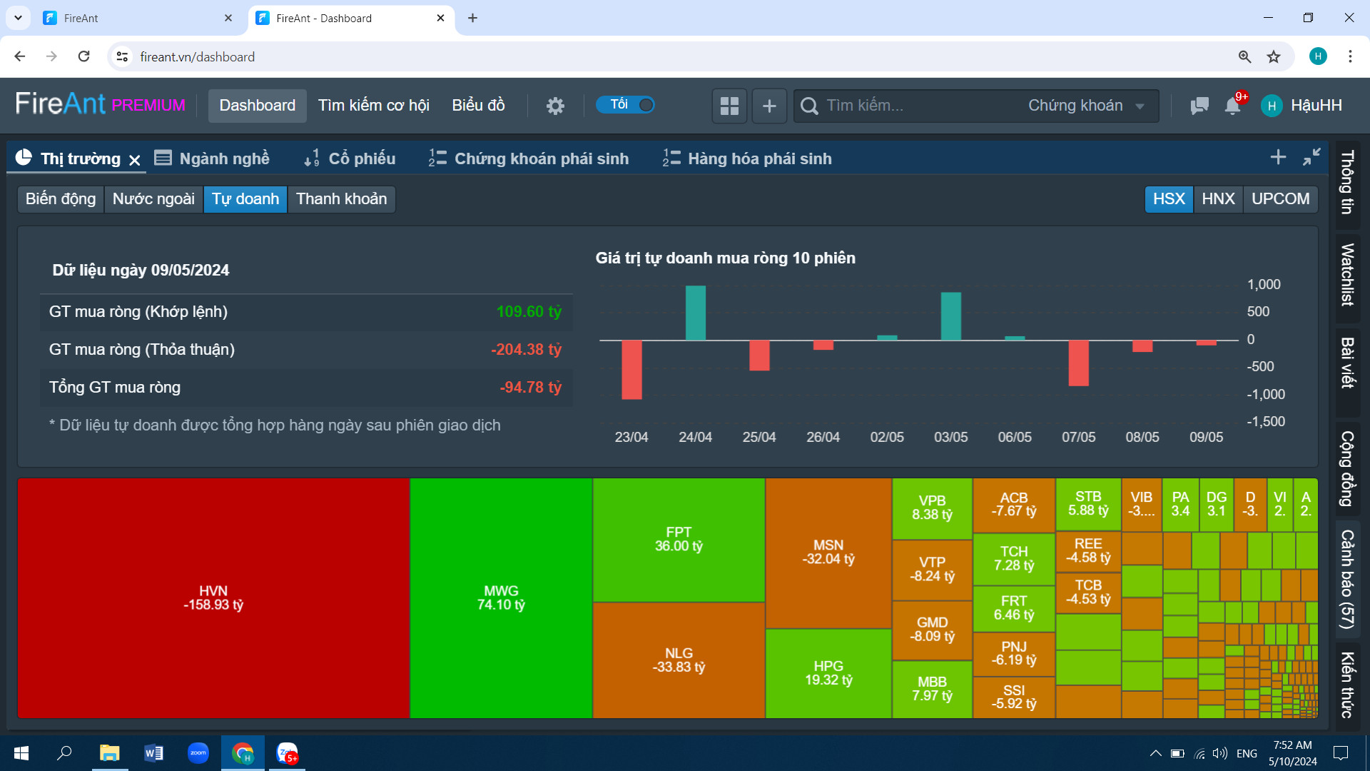 – Thị trường ngày 09 tháng 05 thị trường giao dịch giằng co quanh tham chiếu trong phần lớn phiên giao dịch, sau gần 10 phiên tăng liên tiếp thị trường đã tiệp cận vùng kháng cự nên sẽ có các phiên rung lắc để cân bằng lại cung cầu, đồng thời hấp thụ lượng cổ phiếu chốt lời và kẹt hàng của các nhà đầu tư.