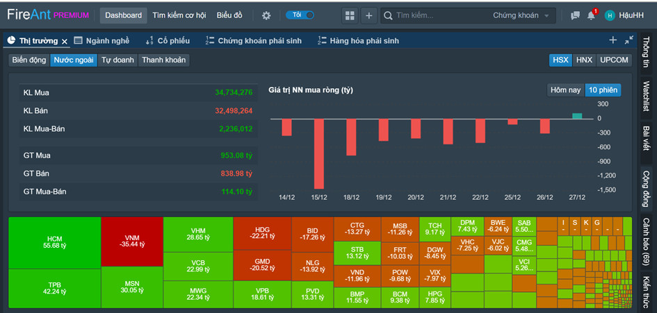 – Thị trường phiên giao dịch ngày 27 tháng 12 thị trường duy trì được sắc xanh trong hầu hết phiên giao dịch, tuy nhiên về cuối phiên lực bán mạnh lên khiến thị trường chịu áp lực và dóng cửa giảm nhẹ, sau 6 phiên tăng điểm liên tục thị trường điều chỉnh nhẹ của là điều bình thường.