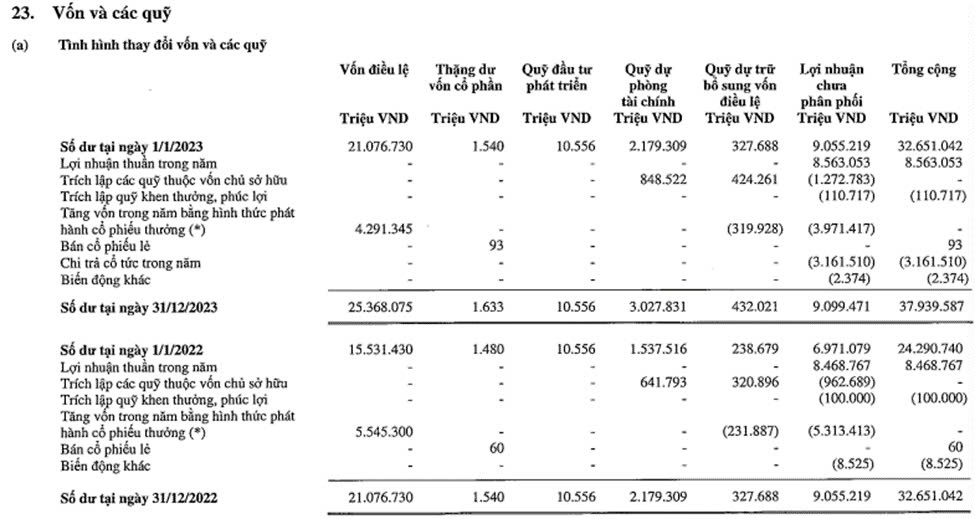 Trong đó, vốn điều lệ của Ngân hàng đã tăng lên mức 25.369 tỷ đồng sau đợt phát hành cổ phiếu thưởng vào cuối quý 3/2022. Ngoài ra, khoản lợi nhuận chưa phân phối cũng đóng góp nhiều vào mức gia tăng của vốn chủ sở hữu (9.099 tỷ).