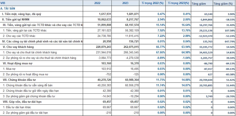 – Tiền mặt, vàng: tại thời điểm 31/12/2023 là 1.681 tỷ đồng, chiếm 0,41% tổng tài sản và tăng 63 tỷ, tương đương 3,9% so với năm 2022, chủ yếu là tiền mặt bằng VND.